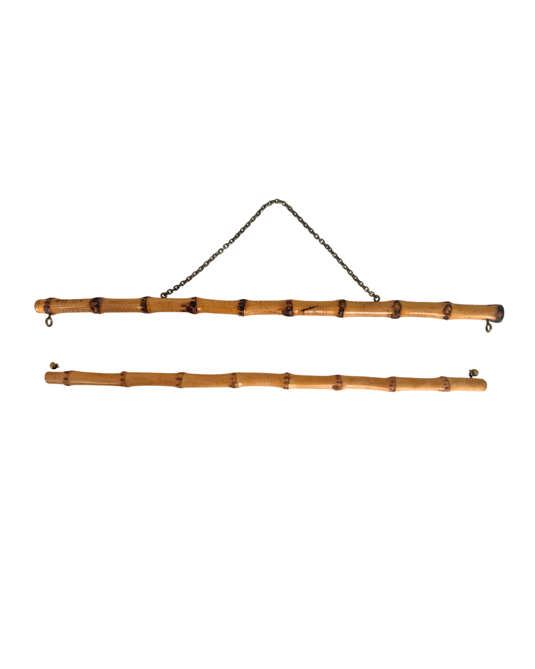 Klokkestreng beslag i bambus fundet i genbrug – velholdt og kan fx bruges til et mindre macramé vægtæppe. Består af over- og underdel, dvs. 2 stk. Obs: nederste beslag er en smule kortere end den øverste!
